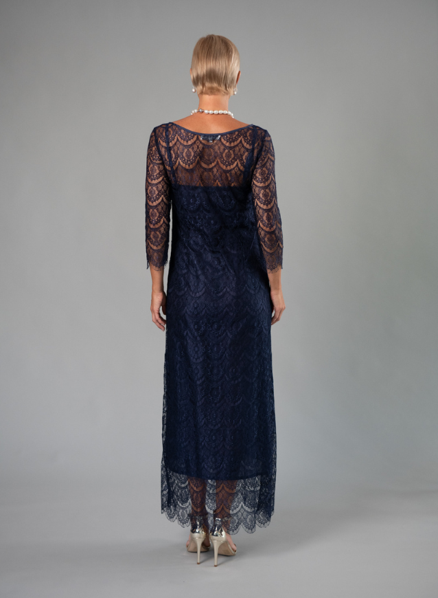 The Madeleine Dress is simple and elegant - a pure silk slip with a scalloped lace sheath with a boat neckline and a 3/4 sleeves scalloped lace sleeve.