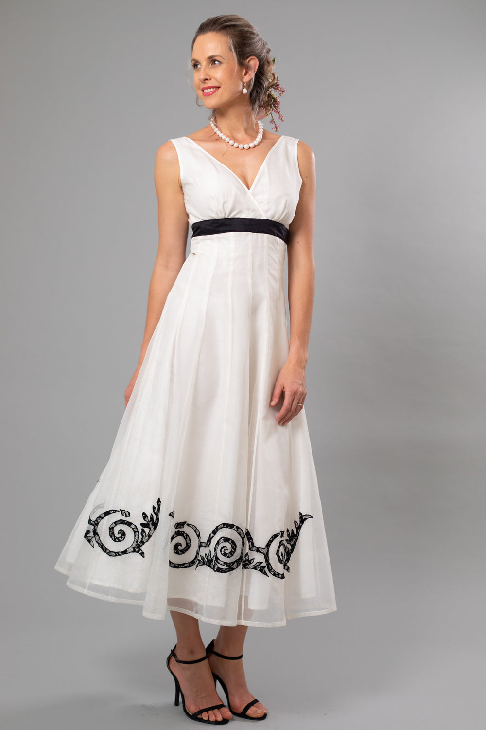 The Applique Tea Length is 16 panels pure silk organza with 16 panels of pure soft silk as the underlay, with Black Lace Applique detail around the hem, and a Black pure silk sash.