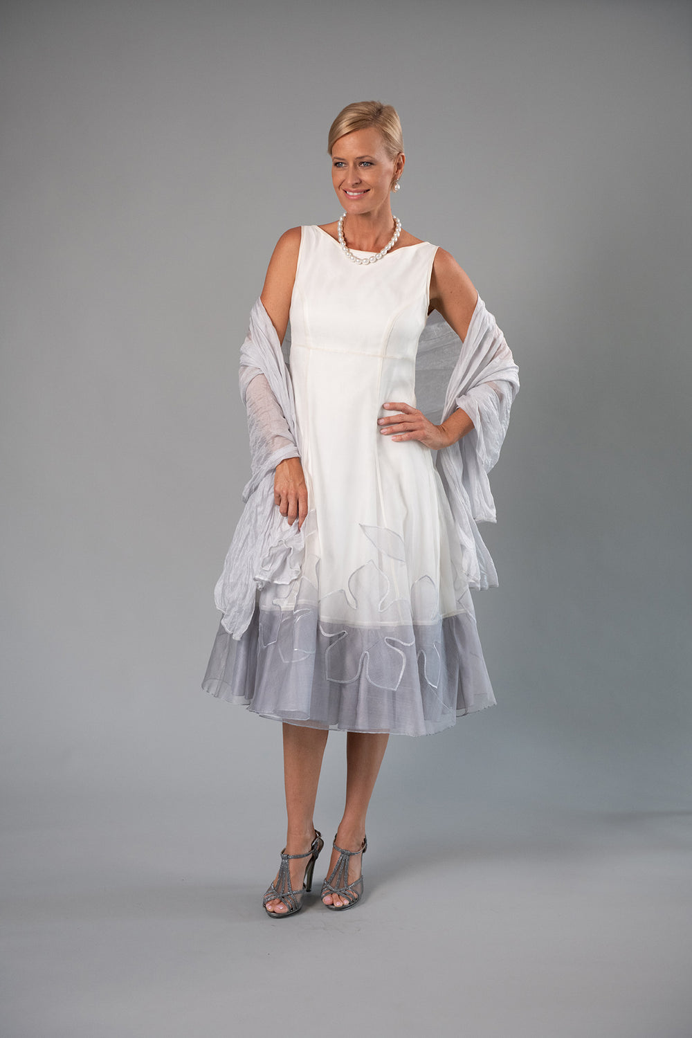 The Larissa Dress is Ivory, with a Silver embroidered hemline, and the extra feature of a little flounce.  The overlay is pure silk organza.